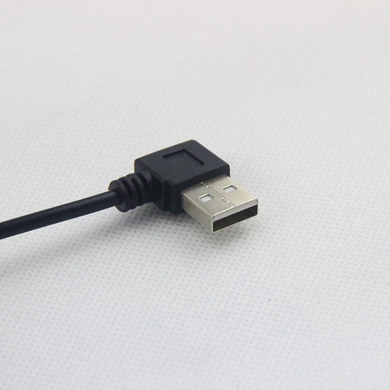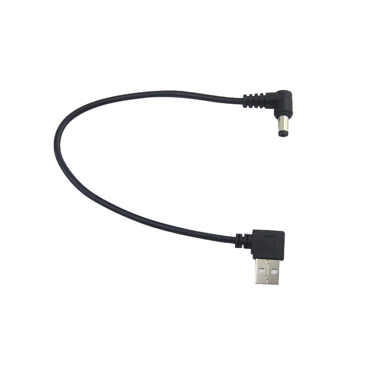 This product is DC 5.5*2.5mm jack to USB A male connector power cable, The cable can support 5V 2A rated power supply, it is usually used to for LED lights, battery and camera device. Both of the connector is 90 degree L shape type. The most obvious feature is that the right-angle elbow changes the direction of the wire through the mold. The L shape angle of the connector makes it possible to eliminate some of the pressure points that a straight-angled connector would otherwise experience. So the 90 degree angle connector usually does a better job of dealing with pressure by making more use of the strain-relief, and it is usually used to the narrow space.